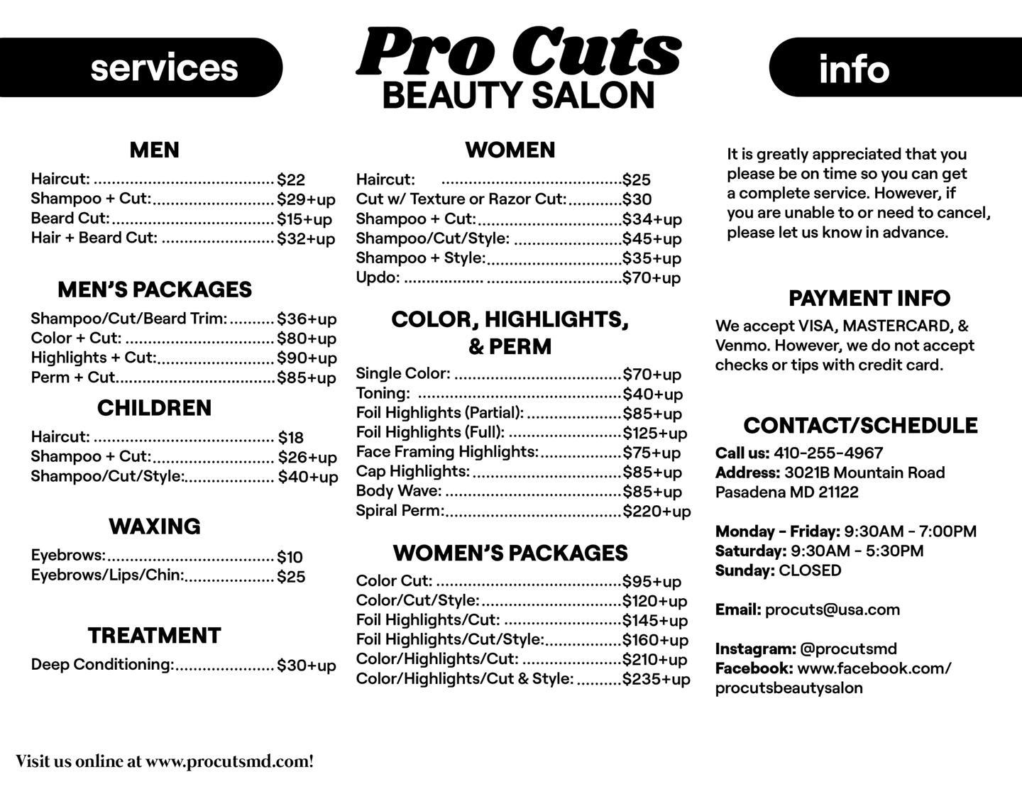 At Pro Cuts we offer professional quality haircuts, styling, and color at an affordable price.We cater to busy families and welcome clients of all ages looking for a fresh look.
